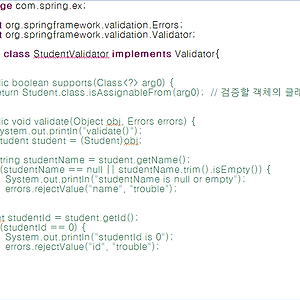 저번 포스팅에서 데이터 검증을 위해 Validator인터페이스의 validate() 메소드를 사용했습니다.이번엔 ValidationUtils 클래스를 사용 해보겠습니다이 클래스는 validate()메소드를 좀더 편리하게 사용 할 수 있도록만들어진 클래스 입니다.사용법은 간단합니다 바로 테스트 해보겠습니다저번 포스팅때 사용한 StudentValidator.java 파일입니다 123456789101112131415161718192021222324252627282930313233343536package com.spring.ex; import org.springframework.validation.Errors;import org.springframework.validation.ValidationUtils;imp..