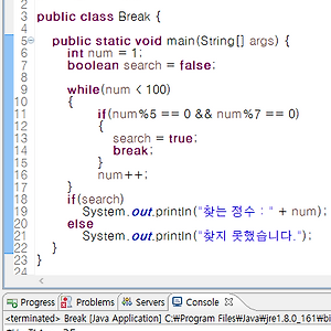 이번엔 JAVA 의 continue 과 break 에 대해 알아보겠습니다먼저 continue & break 는 반복문 내에 삽입이 되어, 반복문의실행 흐름을 조절하는데 사용되는 키워드입니다.따라서 이 둘을 적절히 사용하면 보다 다양한 형태의 반복문을구성할수 있습니다. 먼저 break문을 사용해 보겠습니다.break문은 반복문을 빠져 나가는 용도로도 사용이 됩니다.보통은 if문과 함께 사용되어서 특정 조건이 만족될 때, 반복문을빠져나가도록 구성합니다. break는 이해와 적용이 어렵지 않은키워드이므로 바로 테스트 해보겠습니다. break문을 사용해서 원하는 값을 찾아낸다음 바로해당 구문을 빠져 나갑니다. 즉 5와 7로 나누어지는35를 찾게되고 search 값이 true 되면서 if문과 자기를감싸고 있는 가..